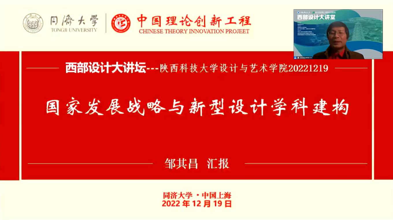 12月19日晚,應(yīng)我校設(shè)計(jì)與藝術(shù)學(xué)院、科技處及前沿院邀請(qǐng),同濟(jì)大學(xué)鄒其昌教授做客我?!扒把乜茖W(xué)報(bào)告”,作了題為“國(guó)家發(fā)展戰(zhàn)略與新型設(shè)計(jì)學(xué)科建構(gòu)”的學(xué)術(shù)報(bào)告。報(bào)告會(huì)由設(shè)藝學(xué)院院長(zhǎng)劉宗明教授主持,設(shè)藝學(xué)院相關(guān)專業(yè)師生及全國(guó)藝術(shù)設(shè)計(jì)同行近300人參加此次報(bào)告會(huì)。