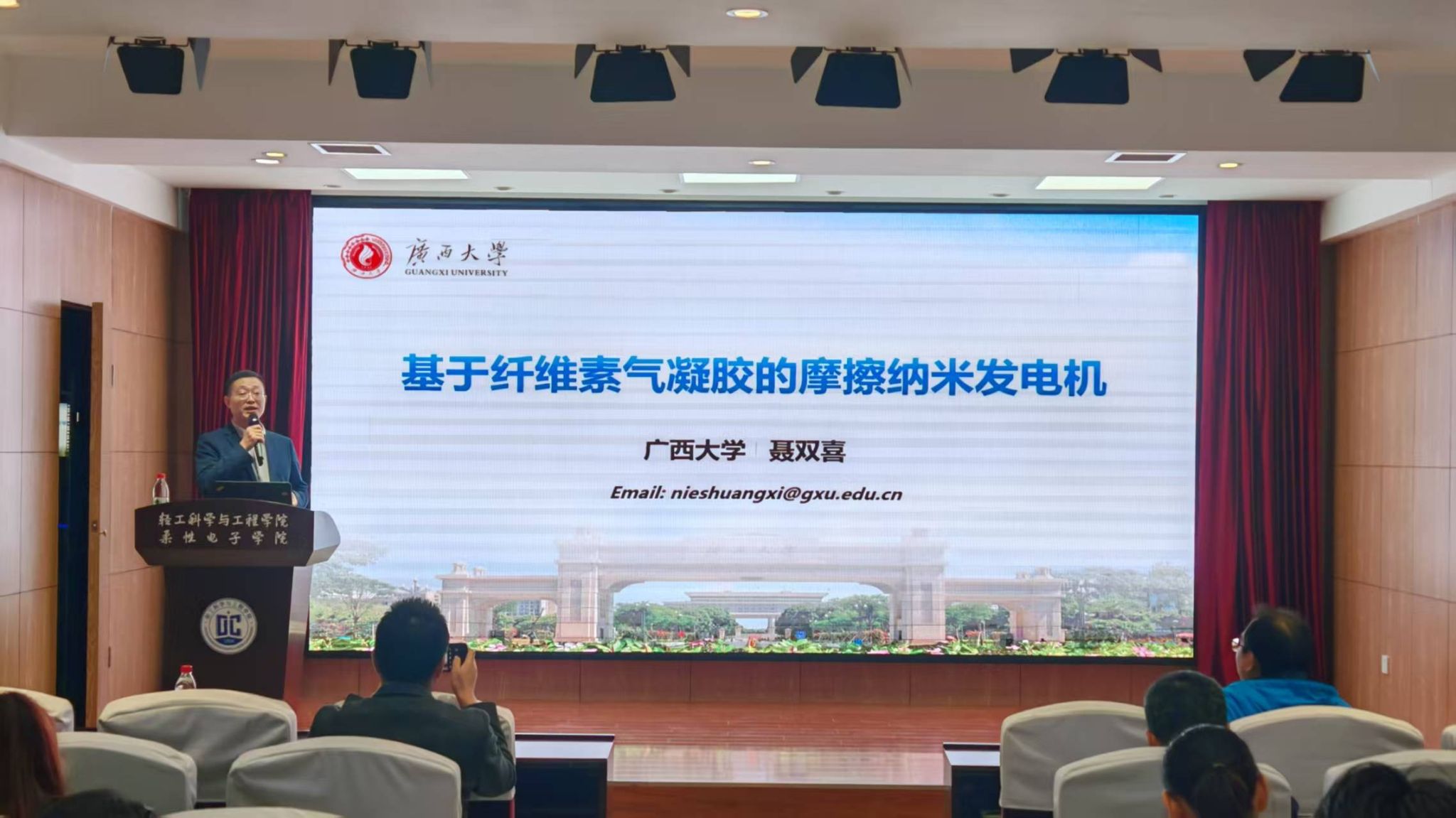 10月20日,應(yīng)輕工學院(柔性電子學院)和科技處、前沿院邀請,廣西大學聶雙喜教授做客我?!扒把乜茖W報告”,做題為“基于纖維素氣凝膠的摩擦納米發(fā)電機”的學術(shù)報告,輕工學院相關(guān)教師和學生參加會議。