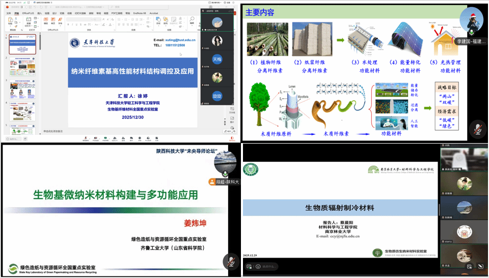12月29日-31日,應(yīng)輕工科學(xué)與工程學(xué)院、科技處、前沿院和研究生院邀請(qǐng),天津科技大學(xué)徐婷教授、福建農(nóng)林大學(xué)李建國教授、南京林業(yè)大學(xué)蔡晨陽副教授、齊魯工業(yè)大學(xué)姜煒坤副教授,分別做客陜西科技大學(xué)“前沿科學(xué)報(bào)告”和“未央導(dǎo)師論壇”,作了有關(guān)生物質(zhì)功能材料與應(yīng)用系列線上學(xué)術(shù)報(bào)告。輕工學(xué)院相關(guān)專業(yè)的教師和研究生參加了上述報(bào)告會(huì)。