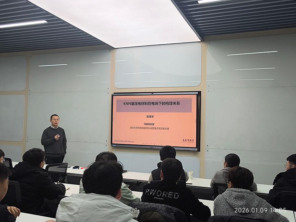 2026年1月9日下午,烏鎮(zhèn)實(shí)驗(yàn)室張茂華研究員應(yīng)科技處與材料學(xué)院邀請(qǐng)做客我?!扒把乜茖W(xué)報(bào)告”,作題為“KNN基壓電材料在電場(chǎng)下的構(gòu)效關(guān)系”的學(xué)術(shù)報(bào)告。報(bào)告會(huì)由材料學(xué)院副院長(zhǎng)伍媛婷主持,學(xué)院相關(guān)專(zhuān)業(yè)教師及研究生參加此次報(bào)告會(huì)。